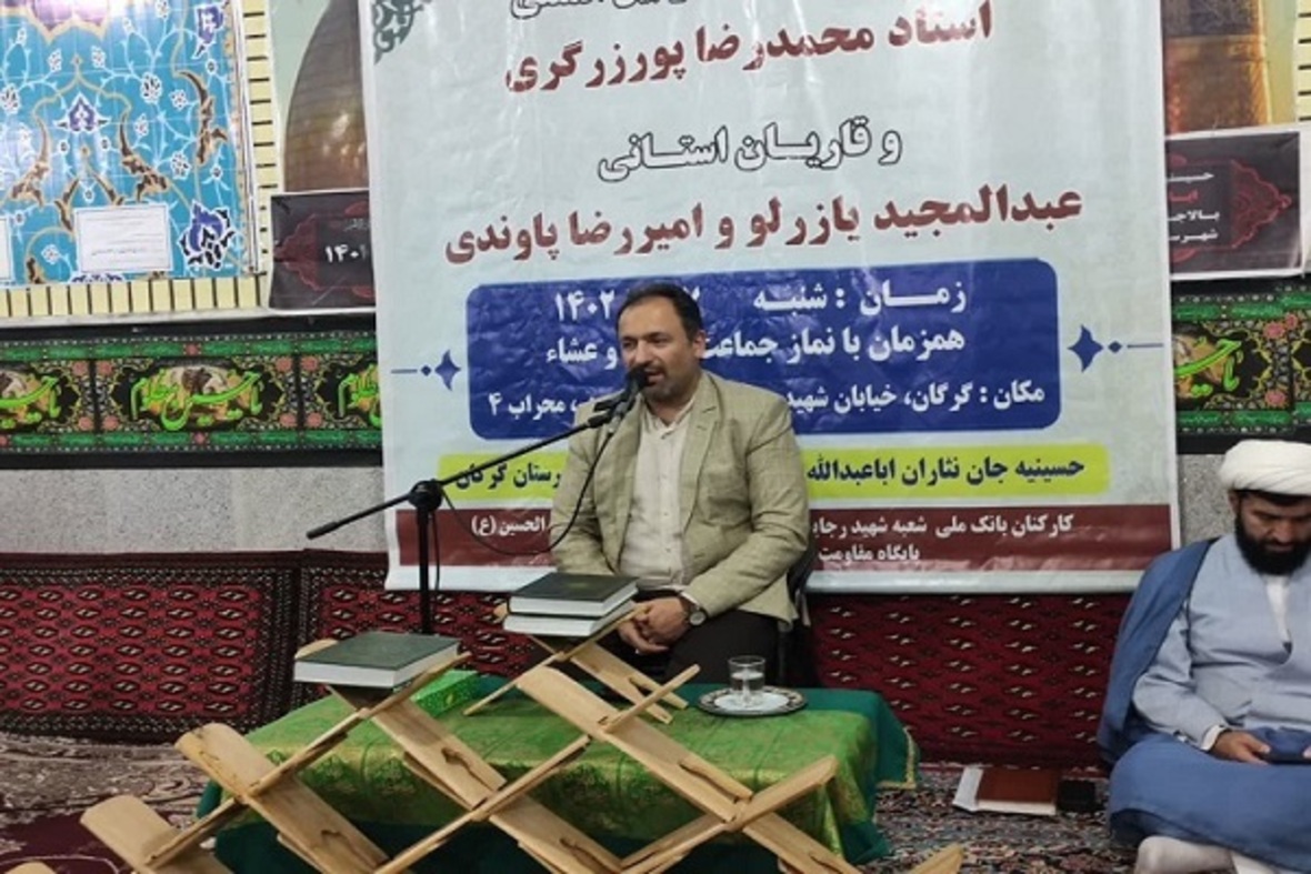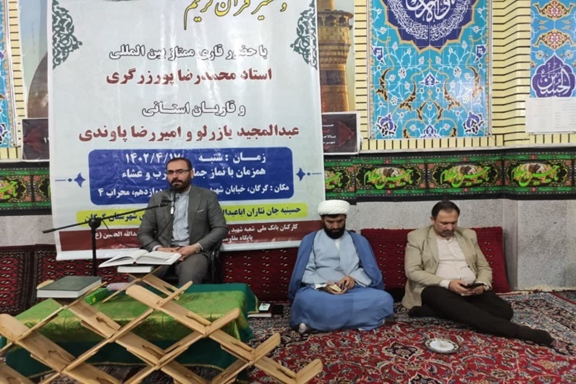 به مناسبت ولادت امام موسی کاظم(ع) کرسی تلاوت و تفسیر قرآن با قرائت پورزرگری، قاری ممتاز بینالمللی و قاریان استانی عبدالمجید یازرلو و امیررضا پاوندی و با سخنرانی مدیرکل تبلیغات اسلامی گلستان شب گذشته، 17 تیرماه در حسینیه جان نثاران اباعبدالله الحسین(ع) بالاجادیهای گرگان برگزار شد.